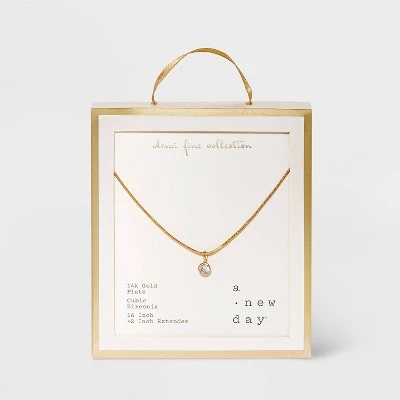The 14K Gold Plated Cubic Zirconia Herringbone Bezel Chain Necklace from A New Day™ is the perfect accessory to glam up your favorite outfits. It’s made out of 14K gold-plated, nickel-free metal and features a cubic zirconia pendant that adds the perfect amount of shine and sparkle to your outfits. Plus, the lobster-claw clasp helps keep it in place as you go about your day.