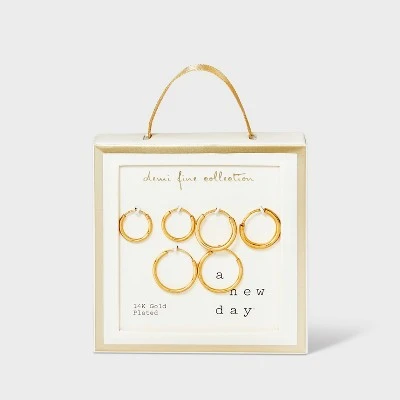 Whether you want to create an understated or noticeable look, the 14K Gold-Plated Trio Hoop Earring Set from A New Day™ will meet all your accessorizing needs. This trio hoop earring set includes three simple sets of hoop earrings in varying sizes. Each piece is designed in a gold tone for easy mixing and matching with your outfits, and boasts a nickel-free construction to suit all types of skin. Add the pieces to your own accessory collection, or gift them to a loved one for their birthday, anniversary or any other occasion.