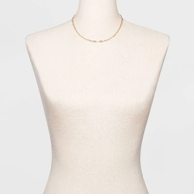 Grace any look with a touch of elegance when you wear the Paper Clip Chain Short Necklace from A New Day™. This necklace features a paper clip chain design with thin, long rings for just the right touch of shine that’s perfect for weekend escapades or a day at the office. A lobster claw clasp ensures you always have a secure fit that’s easy to put on or take off. Plus, it’s made from brass with a rich gold hue for an authentic look you’ll love. Pair with coordinating earrings or bracelets for a complete look that’s sure to have you feeling as lovely as you’ll look.