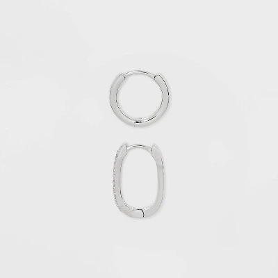Elevate your jewelry assortment with this Sterling Silver Polished Round and Pave Rectangular Huggie Hoop Earrings from A New Day™. This set of silver-finish earrings includes two pairs of huggie hoops — one with a rectangular silhouette with paved clear crystals on the front and another with a thick round shape. Made of sterling silver, these lightweight earrings come with hinged closures for secure and easy wear.