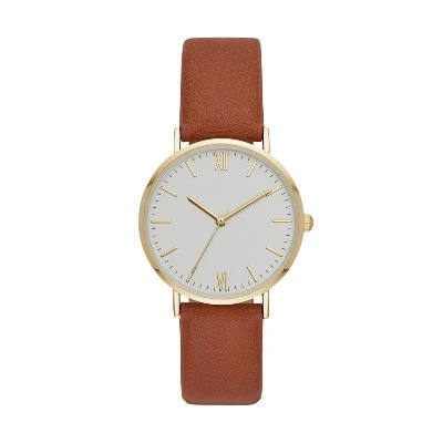 The Classic Roman Strap Watch from A New Day™ is perfect for work or casual, everyday wear. Sleek and sophisticated, the round wristwatch features yellow-gold metal trim along the face with analog time display, along with Roman numeral markers at the sixth and twelfth hours. The textured, brown faux-leather strap brings extra appeal and is secured with a buckle closure for a sure fit.